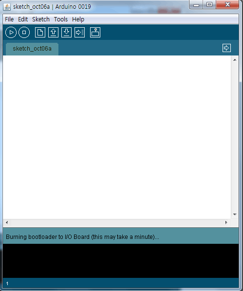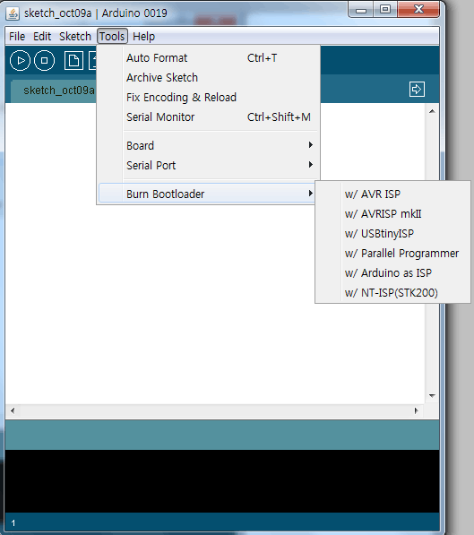 Tools > burn bootloader 를 선택하면 아래와 같은 메세지가 나오면서